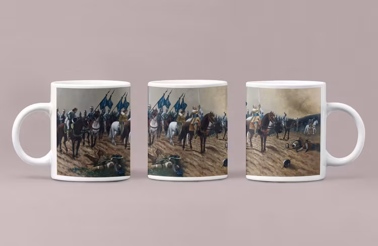 EN KONSTMUGG MED BILD PÅ GUSTAV II ADOLF FÖRE SLAGET VID LÜTZEN AV CARL GABRIEL WADELL.