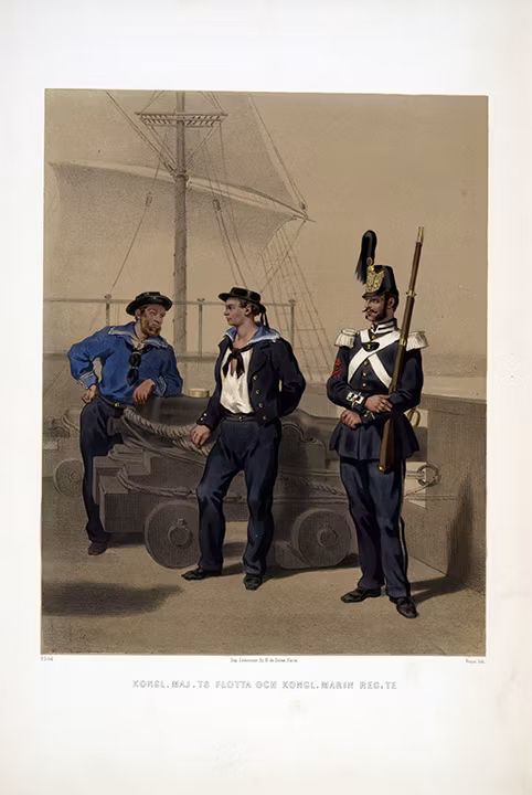 Flottan och Marinregementet. Efter Fritz von Dardel 140 kr 112 kr Flottan och Marinregementet.Plansch i färgtryck efter original av Fritz von Dardel (1817-1901). Ingår i planschsamlingen Den svenska och norske armeens uniformer 1861-1863.Nytryck i storlek 0,60 x 0,40 meter på satin 150 gram/m2 konstpapper.