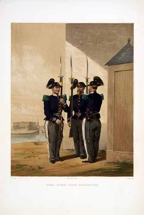 NORSKA GARDETS SKARPSKYTTAR. Efter Fritz von Dardel 140 kr 112 kr NORSKA GARDETS SKARPSKYTTARPlansch i färgtryck efter original av Fritz von Dardel (1817-1901). Ingår i planschsamlingen Den svenska och norske armeens uniformer 1861-1863.Nytryck i storlek 0,60 x 0,40 meter på satin 150 gram/m2 konstpapper.