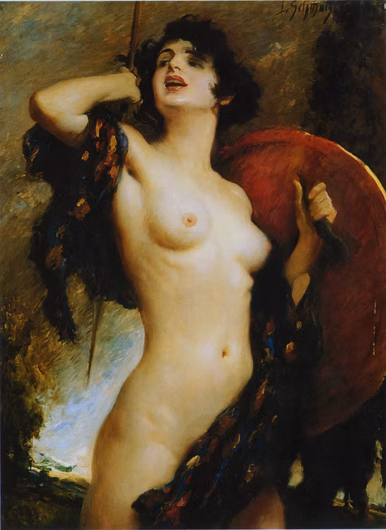 Hans erotiskt laddade framställning av en nordisk-germansk ”Amazon” är mycket typisk för hans gotisk-dekadenta stil.
